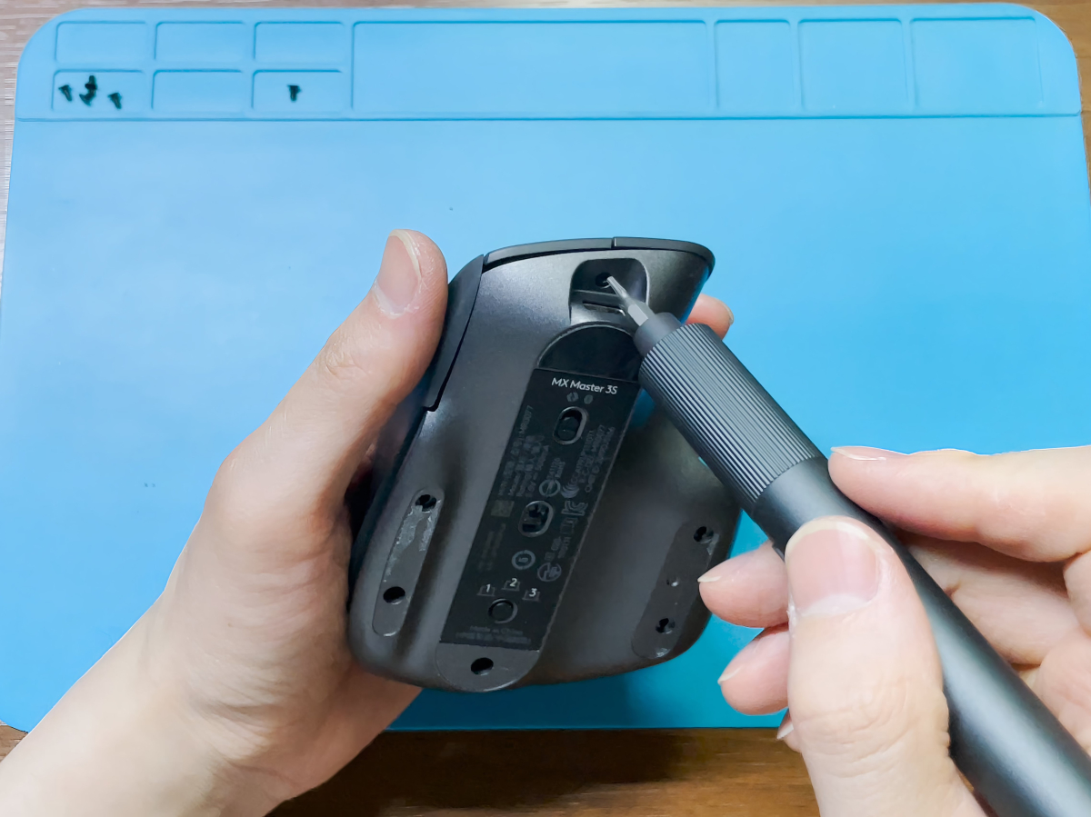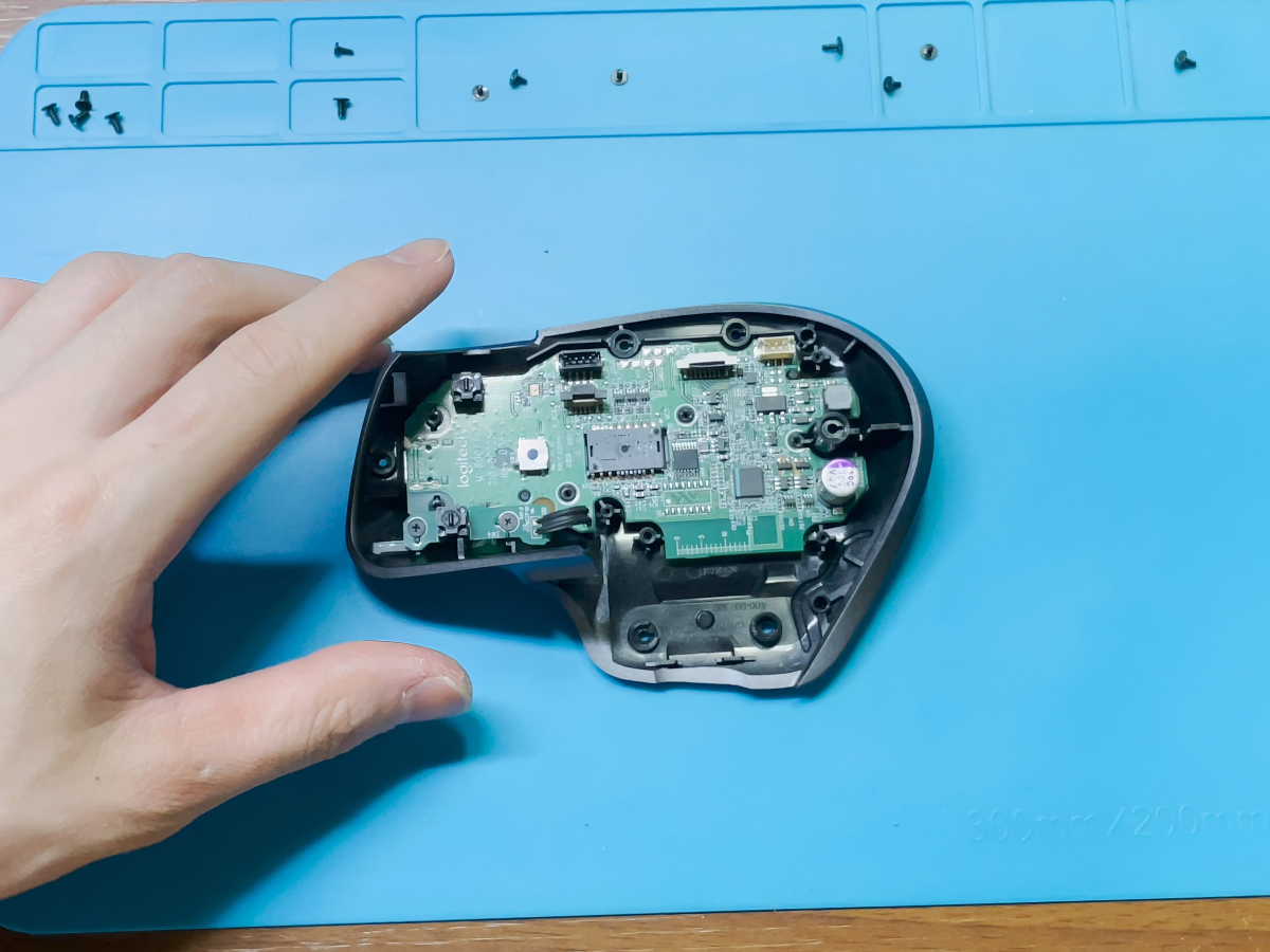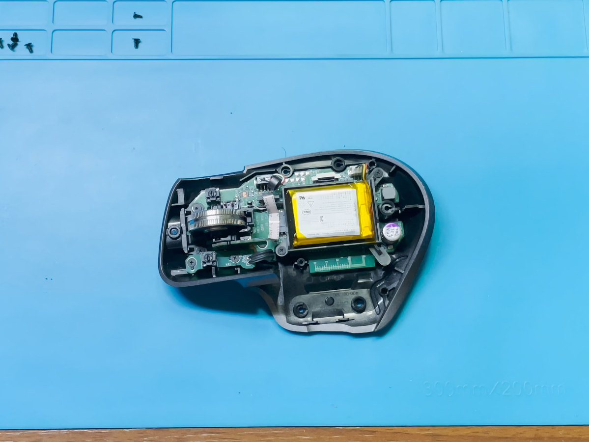 나사를 제거한 후 그냥 뜯으면 되는데 마우스가 생긴게 이상하다 보니 이리저리 비틀며 빼주어야 한다. 고정부가 앞쪽에 두 개 있기 때문에 뒤부터 뺀 후 조심히 제거해 주면 된다.