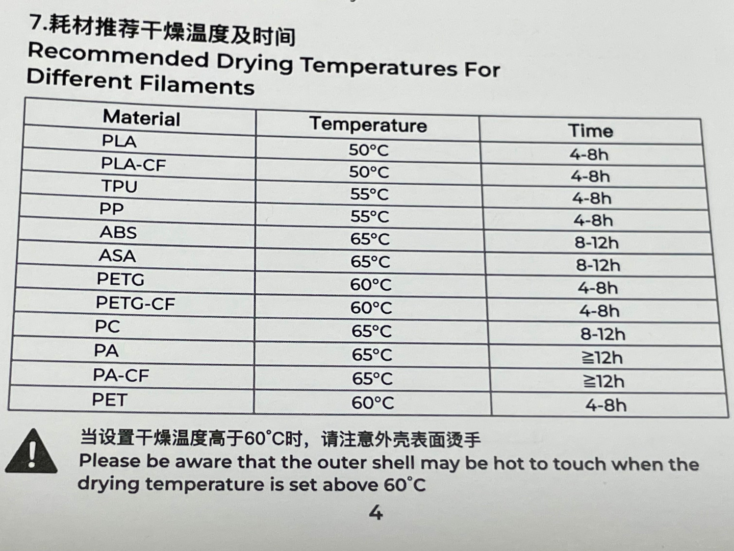 각종 필라멘트 별로 건조 온도와 시간이 표시되어 있다. 딱히 신경 쓸 필요는 없는 게 그냥 기기에서 해당 필라멘트를 선택하면 자동으로 추천온도가 표시된다.