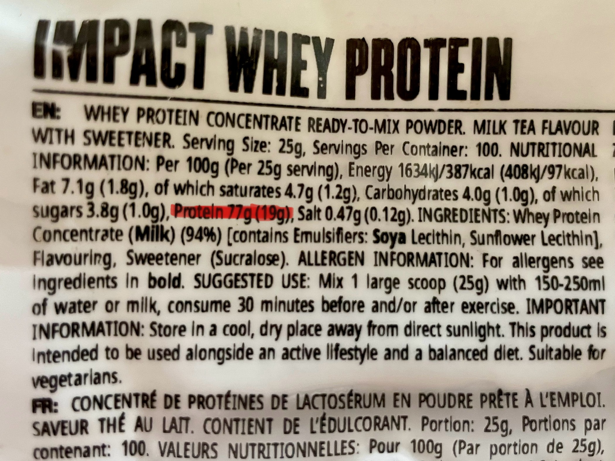 임팩트 웨이 프로틴 밀크티의 단백질량은 1스쿱당 19g으로 무맛에 비하면 2g이 적다. 이전에 먹었던 솔티드 카라멜보다도 1g이 적은셈. 하지만 뭔 상관이라 모자라면 조금 더 퍼먹으면 되는것을.