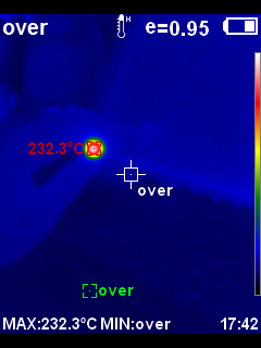 3단(붉은색)으로 켜두고 온도를 측정해 보았다. 예상한 대로의 결과랄까. 한참을 기다려보았지만 온도가 230도 정도로 측정이 된다. 그것도 유지가 되지 않은 채 10도 정도 범위 내에서 출렁인다. 스펙표기상의 460도의 절반밖에 되지 않는 수준. 1단과 2단은 볼 필요도 없다.