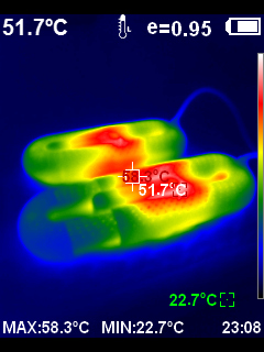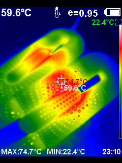 10분 정도가 지난 후 다시 측정해 보았지만 더 이상의 온도 상승은 힘들어 보였다. 발열체의 온도는 더 높겠지만 중앙부 플라스틱 쉘의 온도는 60도가 채 되지 않는다.