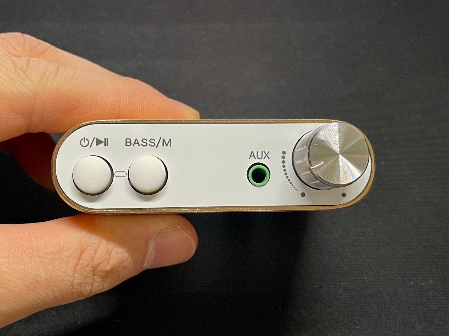정말 콤팩트한 사이즈. 전면부에는 버튼 2개와 볼륨조절 다이얼, AUX 입력단자가 존재한다.