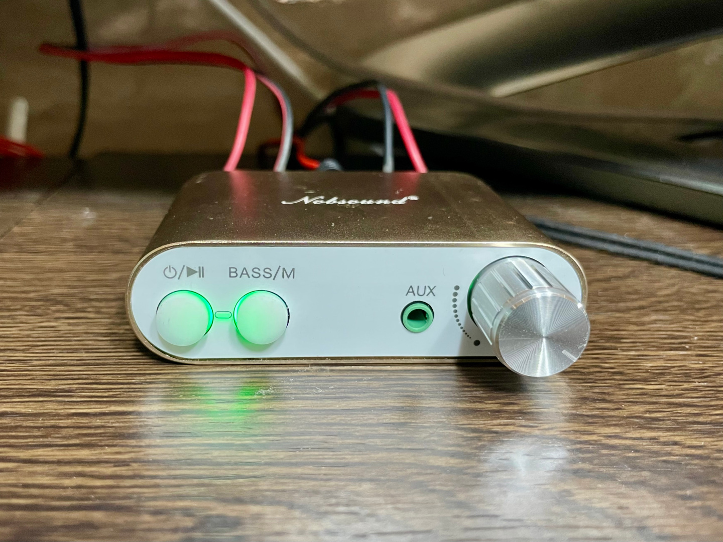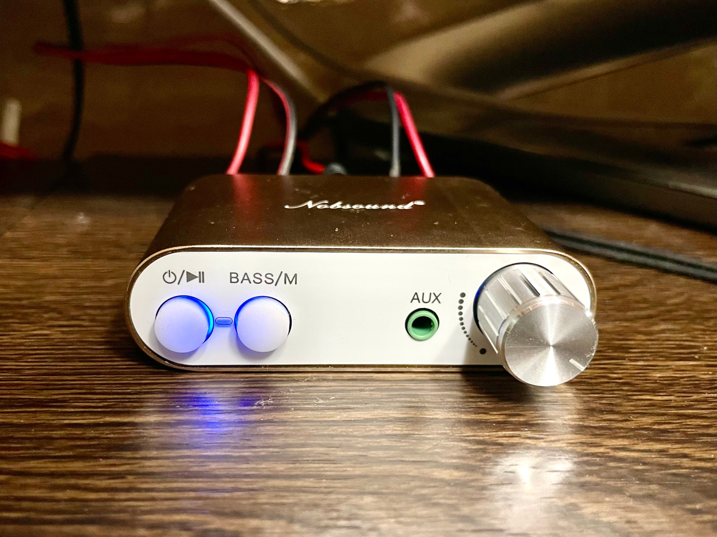 스피커와 연결을 하고 전원을 인가해 보았다. 블루투스 모드로 동작시 전원버튼에 파란색 불이 켜지고, AUX 모드로 동작시 초록색 불이 켜진다. 블루투스 모드로 사용 중에 AUX 케이블을 연결하면 자동으로 AUX모드로 전환이 된다.