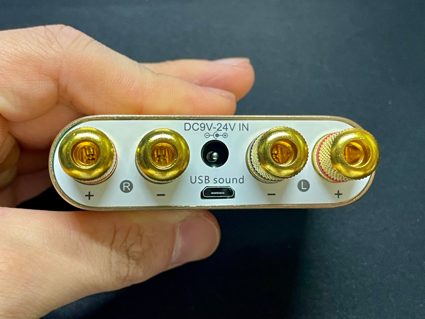 후면부에는 스피커 출력을 위한 좌우 RCA 단자, 전원입력 단자, USB DAC으로 사용을 위한 입력단자가 있다. 기본 구성에 전원 아답터는 포함되지 않으니 구입 시 주의해야 한다.