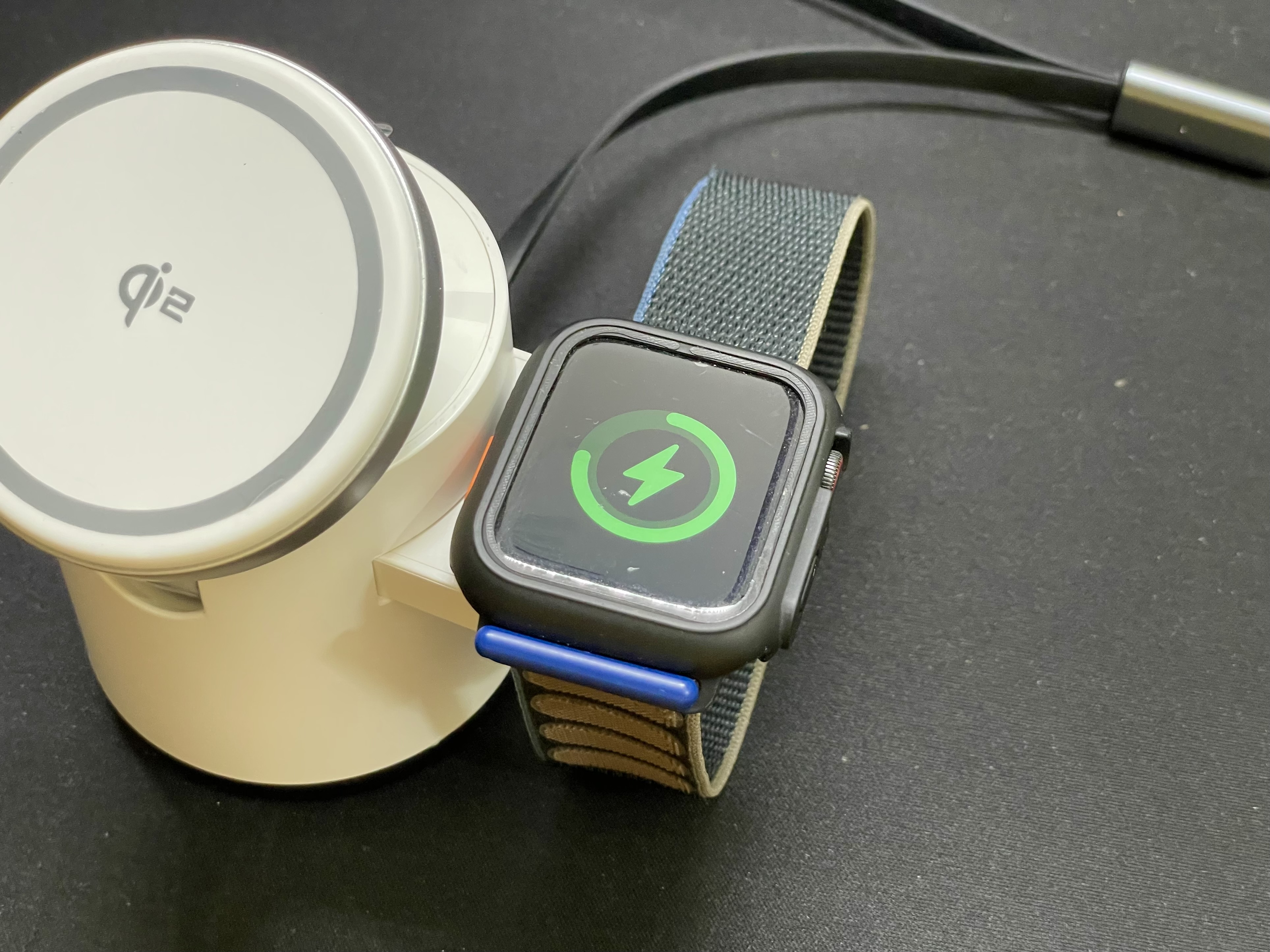 3in1 충전기로 스마트폰, 이어폰, 애플워치 세 가지를 동시에 충전할 수 있다. qi2 인증을 받은 제품.