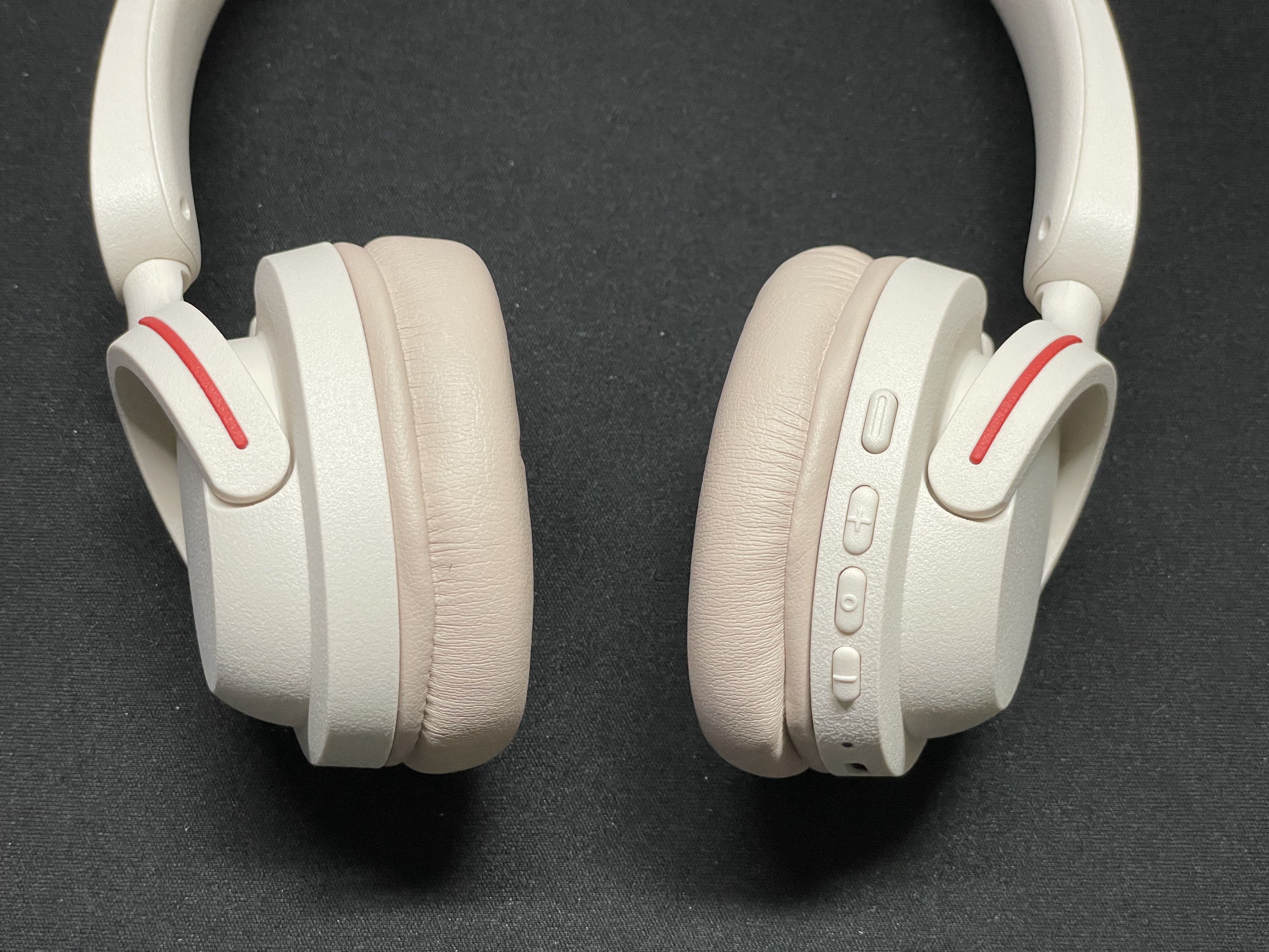 헤드폰 뒷면과 앞면. 빨간 띠가 있는 쪽이 뒤통수 방향이다. 이어 패드도 말랑말랑하니 느낌은 좋다.