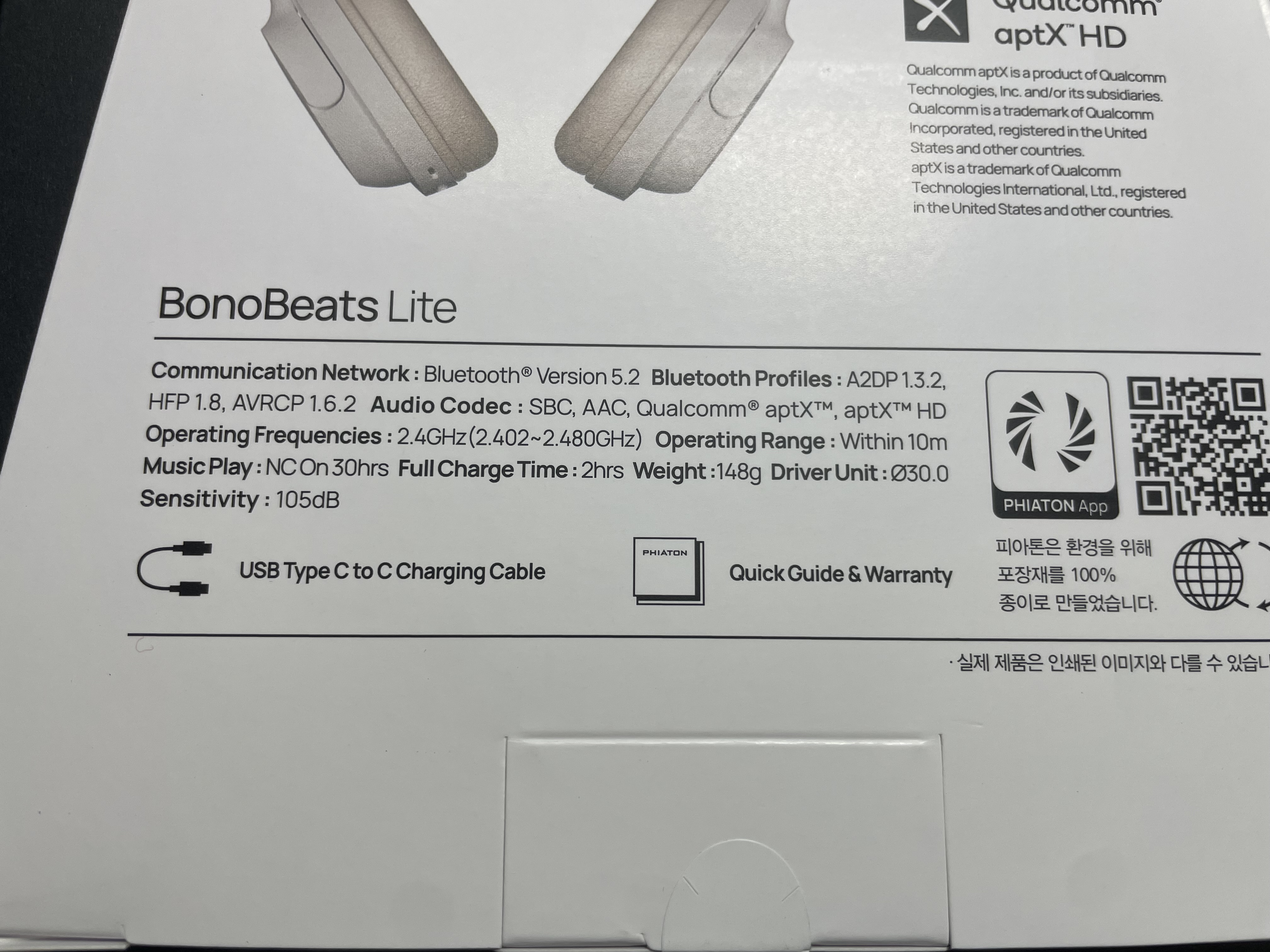 코덱은 aptx HD 까지 지원을 하고, LDAC 등은 지원하지 않는다. 노이스캔슬링과 사용 시 30시간 사용가능하다고 표시되어 있다.