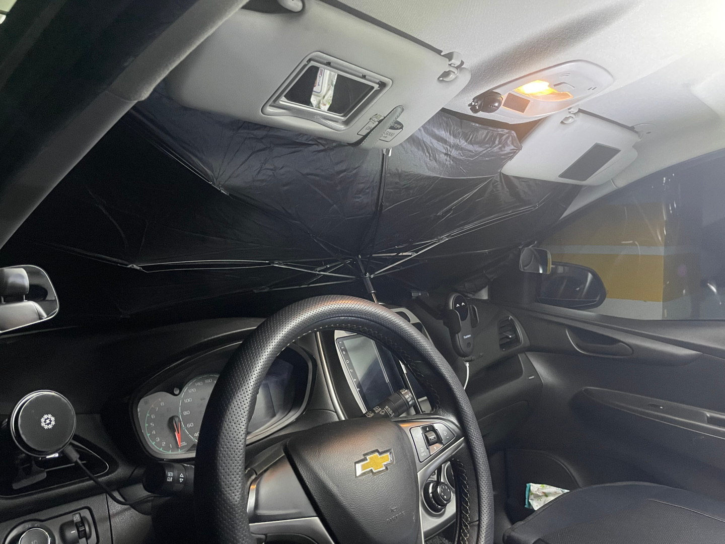 펼쳐서 전면유리를 가리면 이런 모습. 따로 고정하는 기능은 없어서 운전석/조수석의 선바이저를 펼쳐서 눌러주면 고정이 된다.