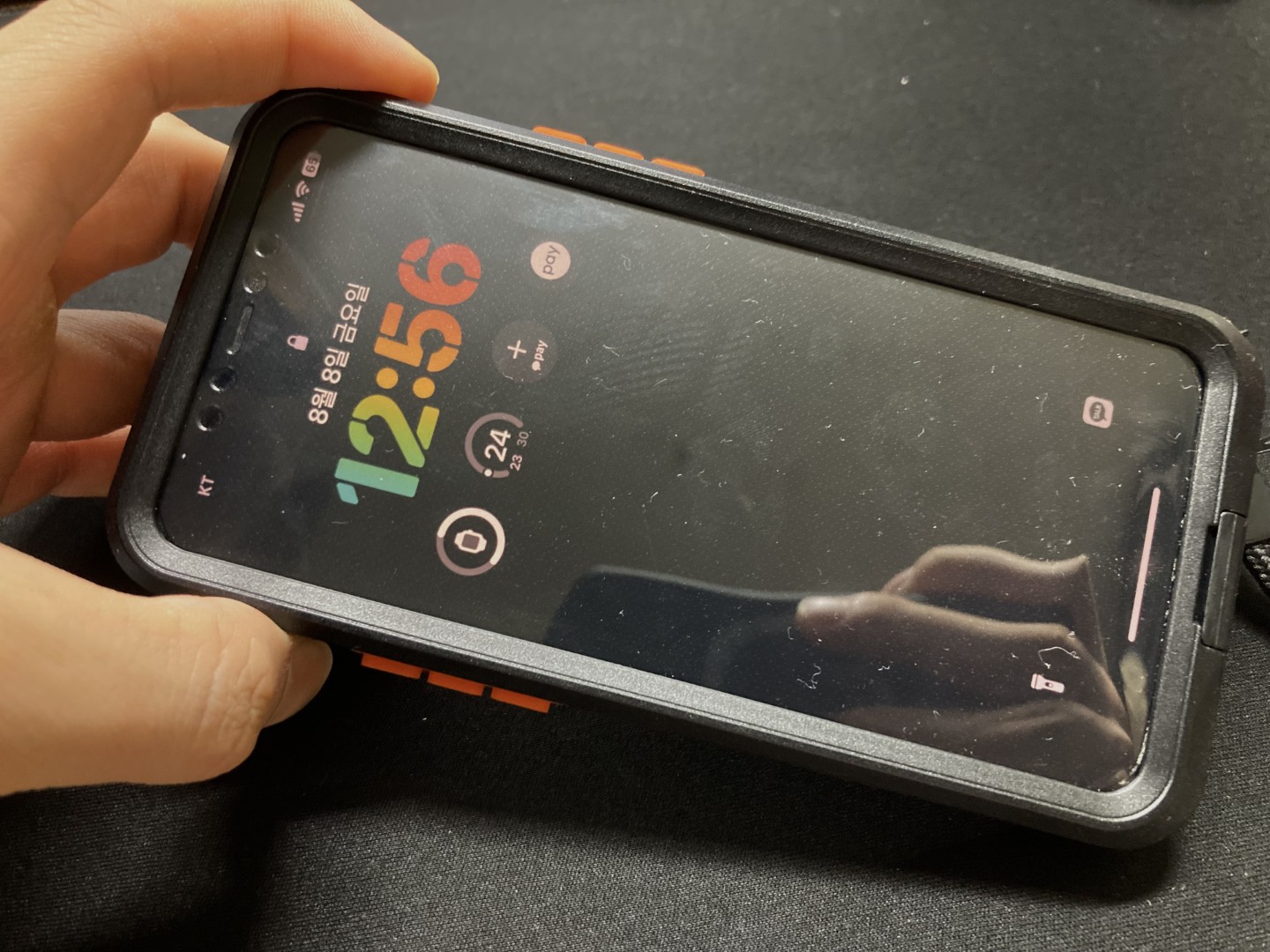 아이폰 12 프로를 넣어보았는데 꽤 두꺼운 전면 강화유리가 창착되어있는데 타이트하긴 하지만 꽤 장착이 잘 되었다. 터치도 잘된다.