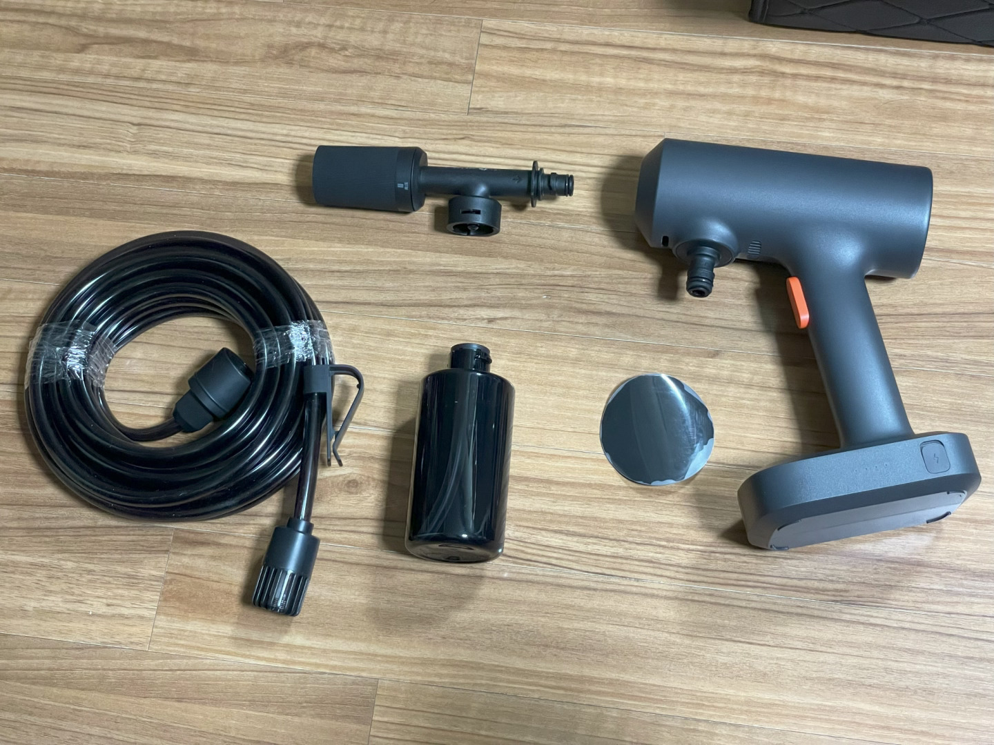 세차용 메인 고압수 세척건으로 쓰기에는 아무래도 분사량의 차이가 있어서 손이 많이 가는 편이라 아쉽고, 세차장에 구비되어 있는 고압수를 한번 쏘고 나서 잔여 거품 제거나 문짝안쪽 등 디테일한 곳 마무리하기에는 좋다. 꼭 세차용도가 아니라도 버킷하나 들고 다니면서 일반 물청소, 야외 간이 샤워기 정도로 활용하기에는 매우 좋다. 알리에서 코인할인이나 세일기간에 구매 해보길 추천.