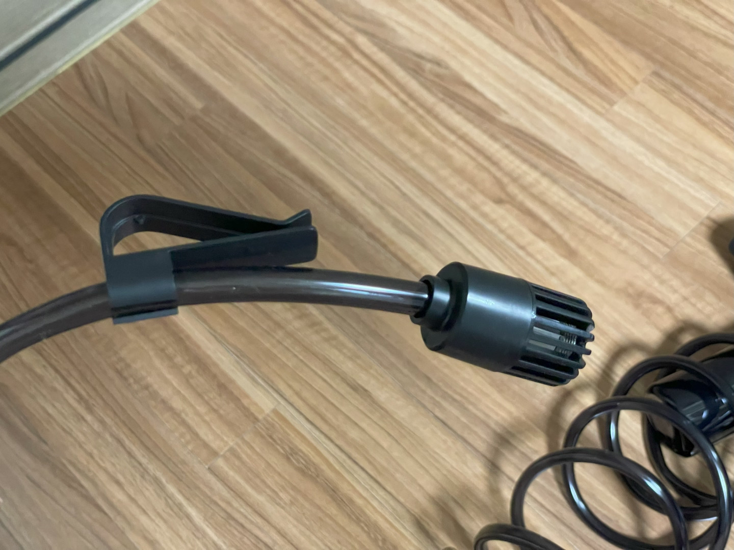 호스는 6M로 넉넉한 편이고 재질은 부드럽다. 클립이 달려있어서 버킷에 고정해 두면 안정적으로 물을 빨아들일 수 있다