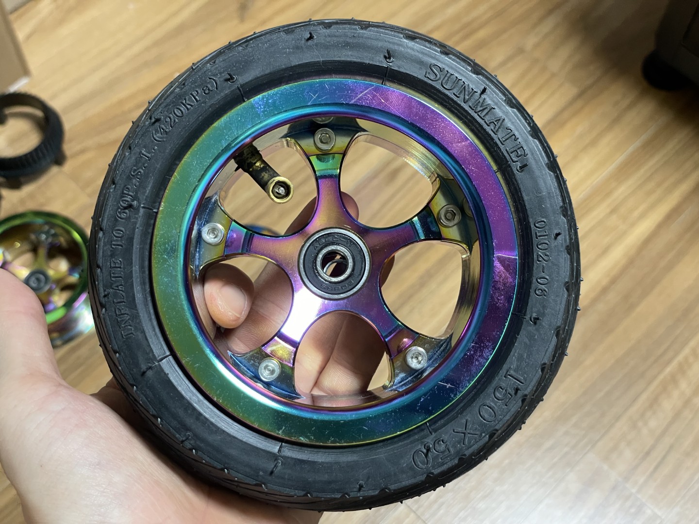 현재 쓰고 있는 6인치 알리발 에어리스 통고무 타이어의 비교. 폭은 조금 넓고, 지름은 조금 작다.