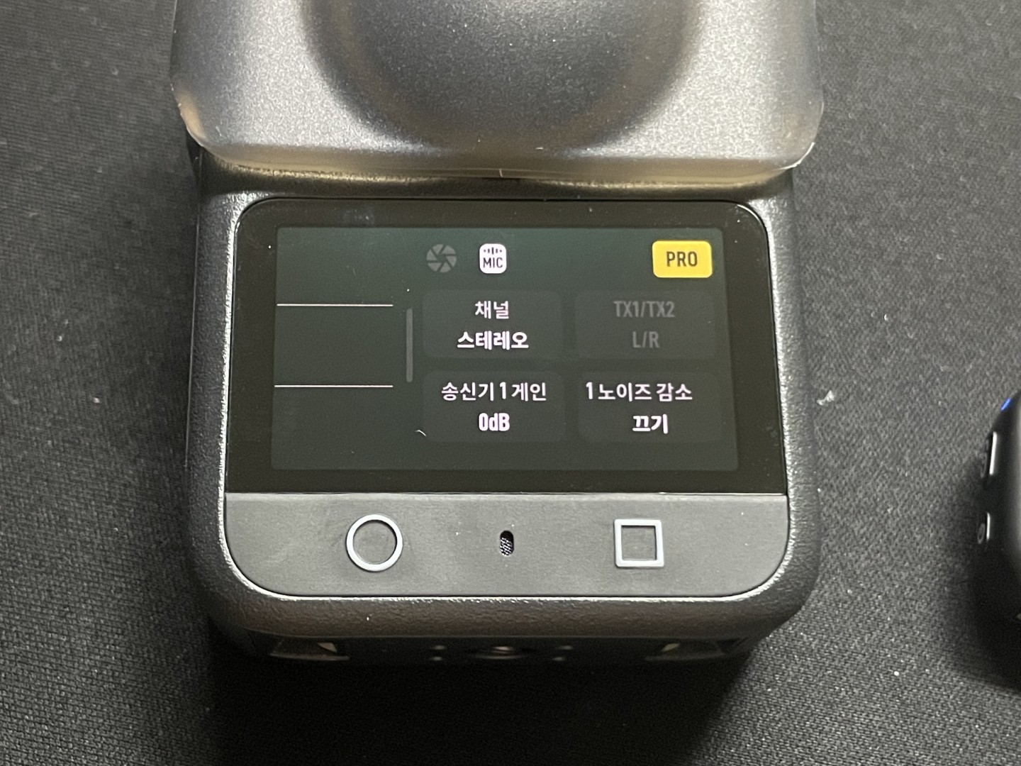 오즈모 360과 연결을 해보았다. 별도의 수신기 없이 바로 연결이 가능하고 마이크의 배터리 잔량과 수음 레벨 게이지가 표시된다.