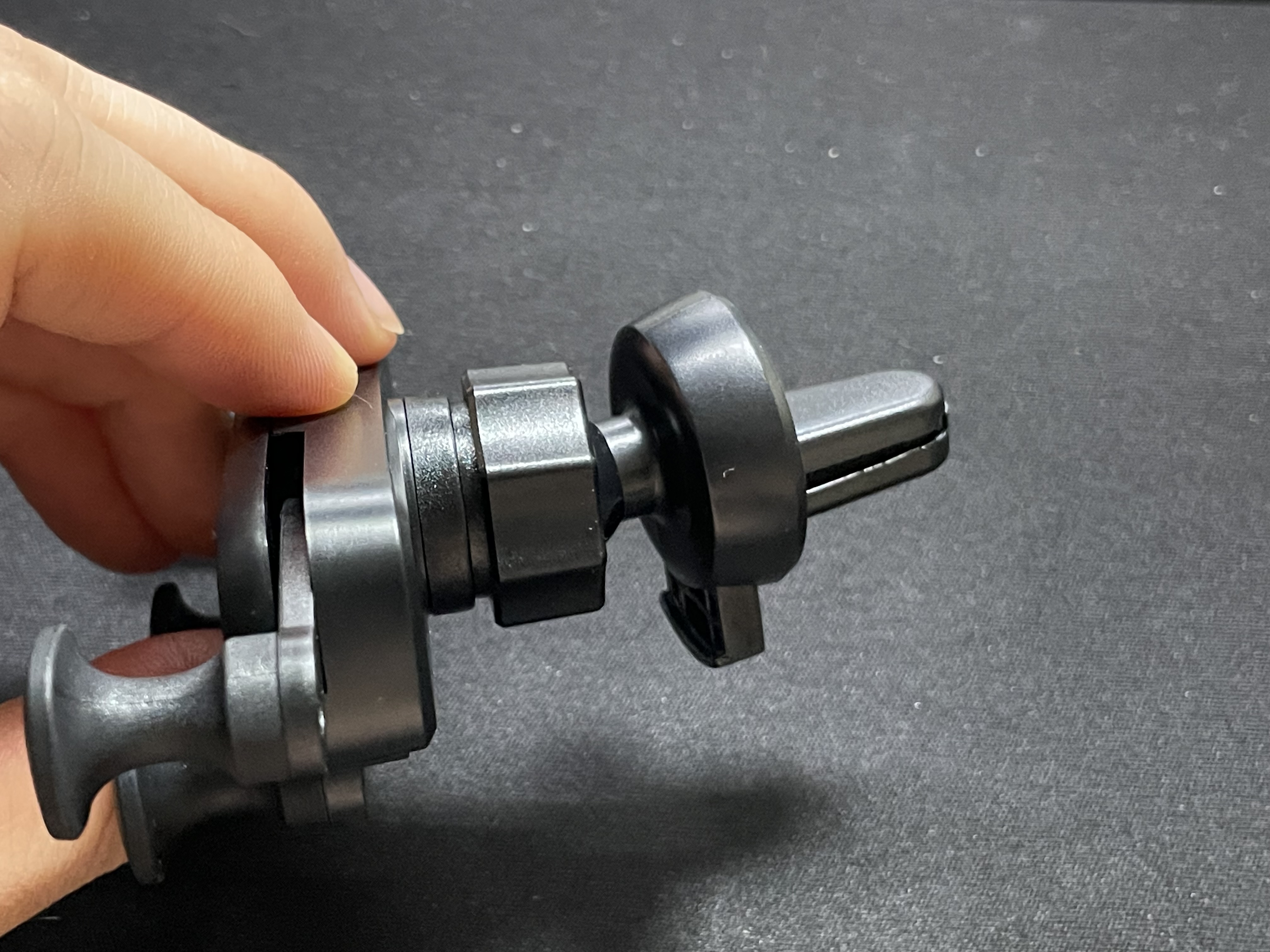 볼헤드 방식으로 차량의 송풍구에 장착할 수 있는 집게가 달려있다.