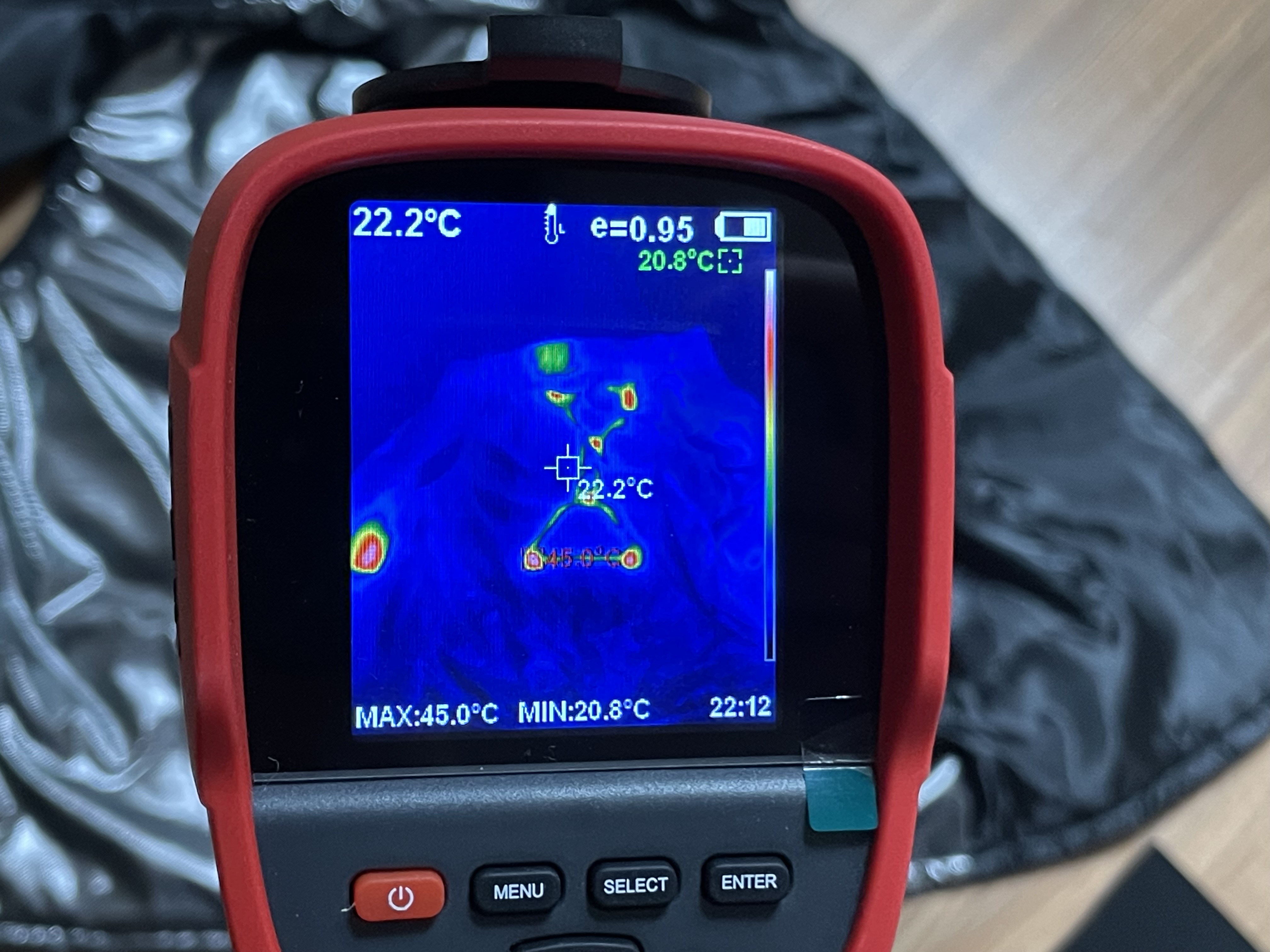 열화상 카메라로 살펴보니 제품 이미지처럼 전체적으로 열선이 깔려있지는 않고, 부분 부분 스팟에 열선 패드가 자리 잡고 있다. 등에 6개, 목에 1개 앞면에 2개 해서 총 9곳.