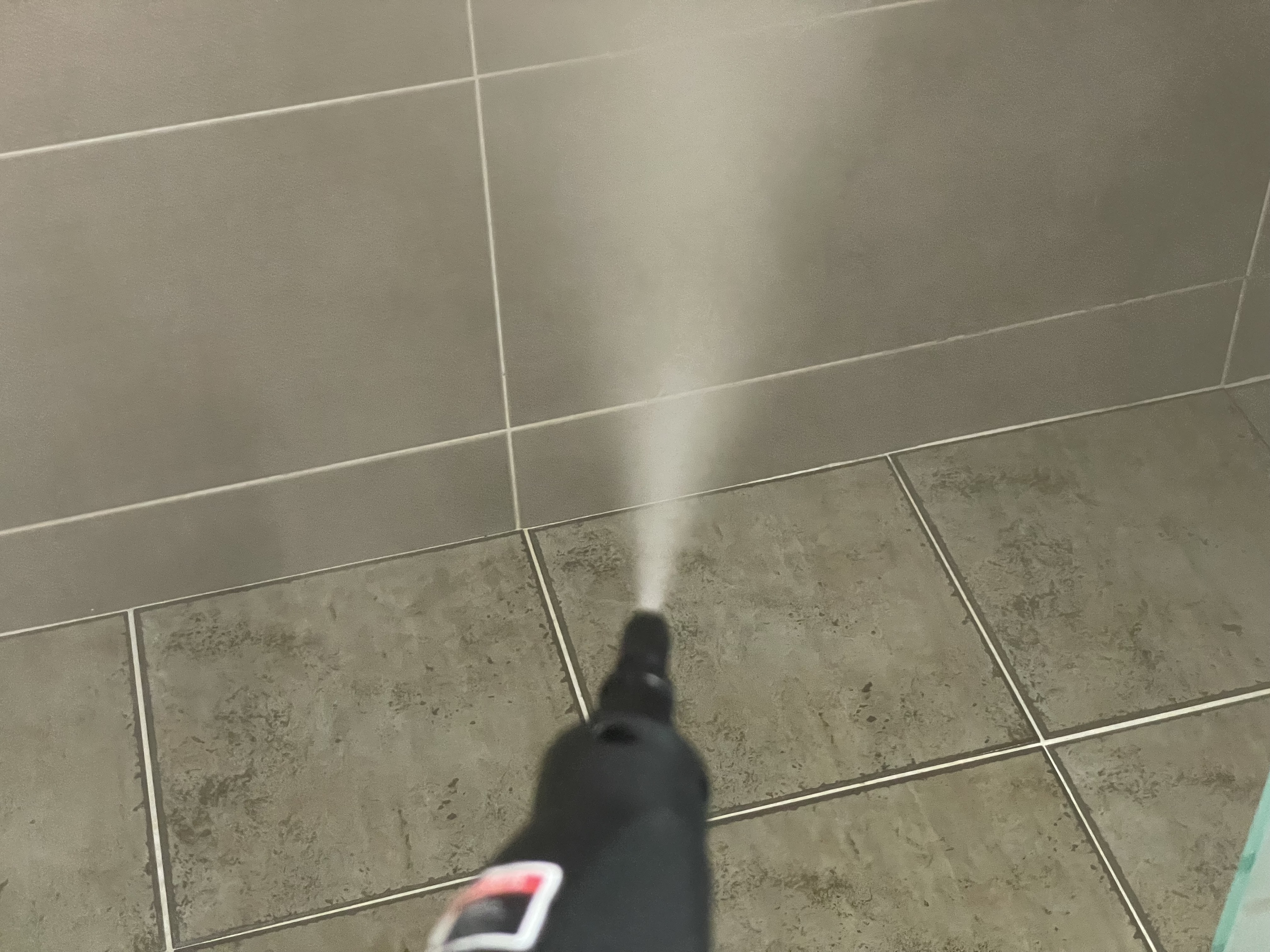 기본 노즐, 최고 분사량으로 스팀청소기를 작동시켜 보았다. 스팀은 수초내로 빠르게 분사되는 편이고, 스팀분사량도 많다.