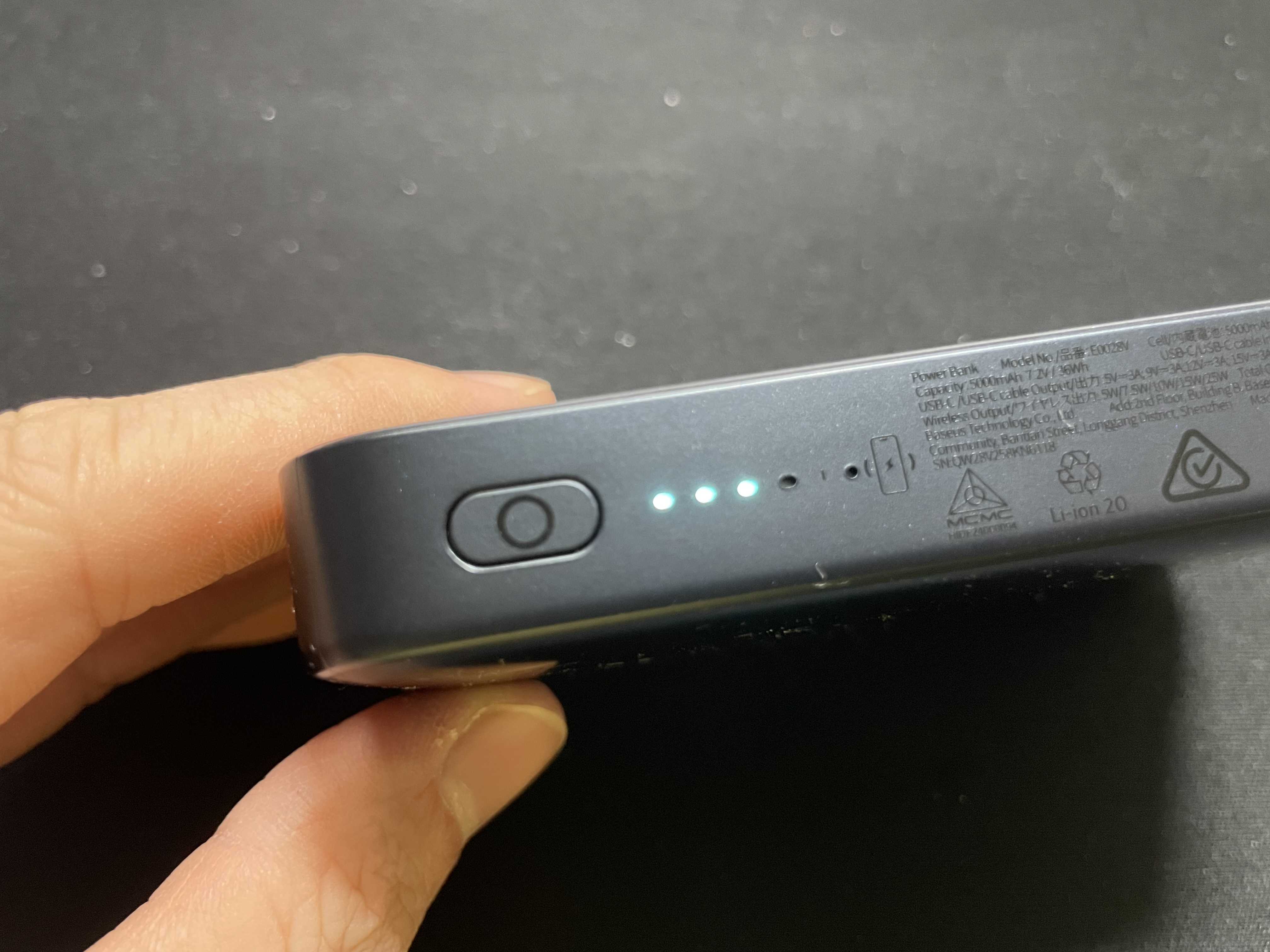 전원 버튼과 LED표시등. 무선충전을 할 때는 가장우측의 LED가 별도로 켜진다.