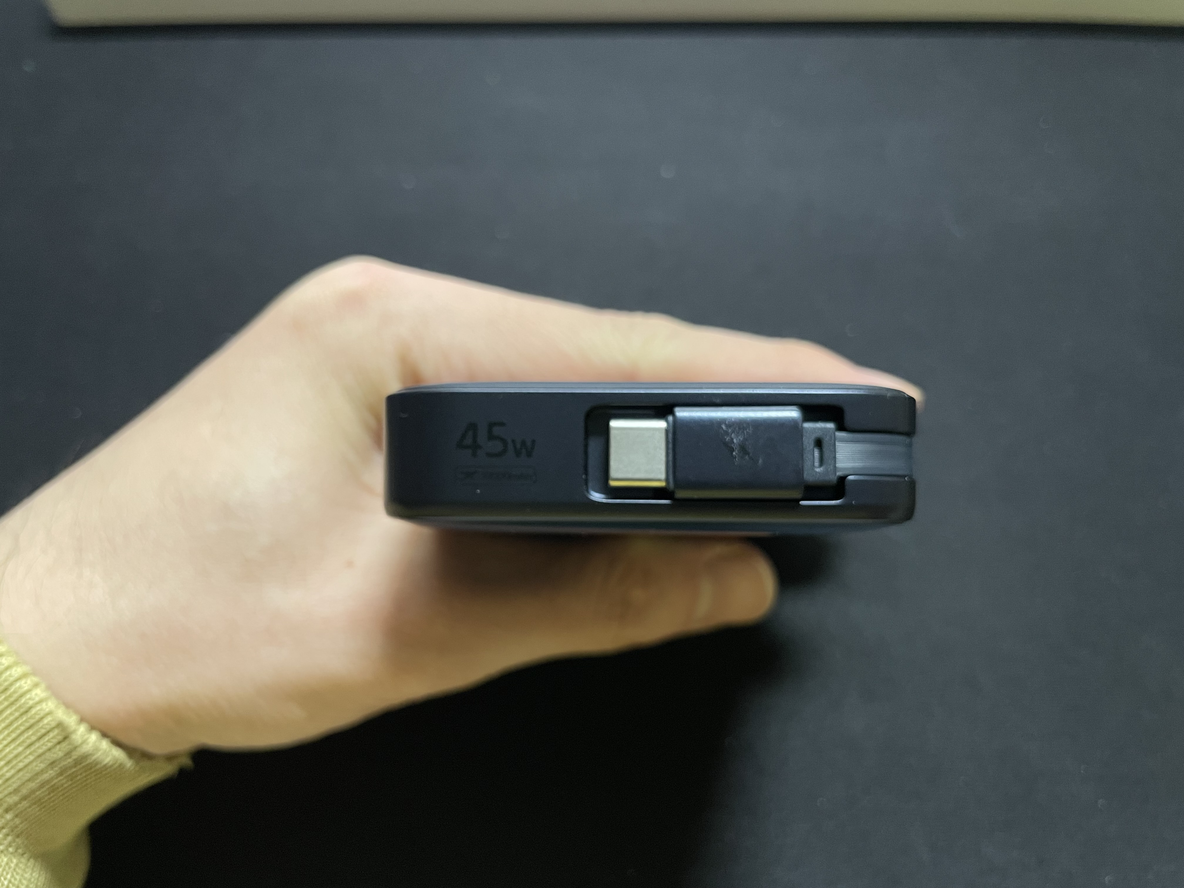기본적으로 45W 고속충전이 가능한 USB C타입 케이블이 빌트인 되어있어서 별도의 충전케이블을 휴대하지 않아도 되는 편리함이 있다. 다만 케이블은 짧은 편이라 움직이면서 사용은 힘들어 보인다.