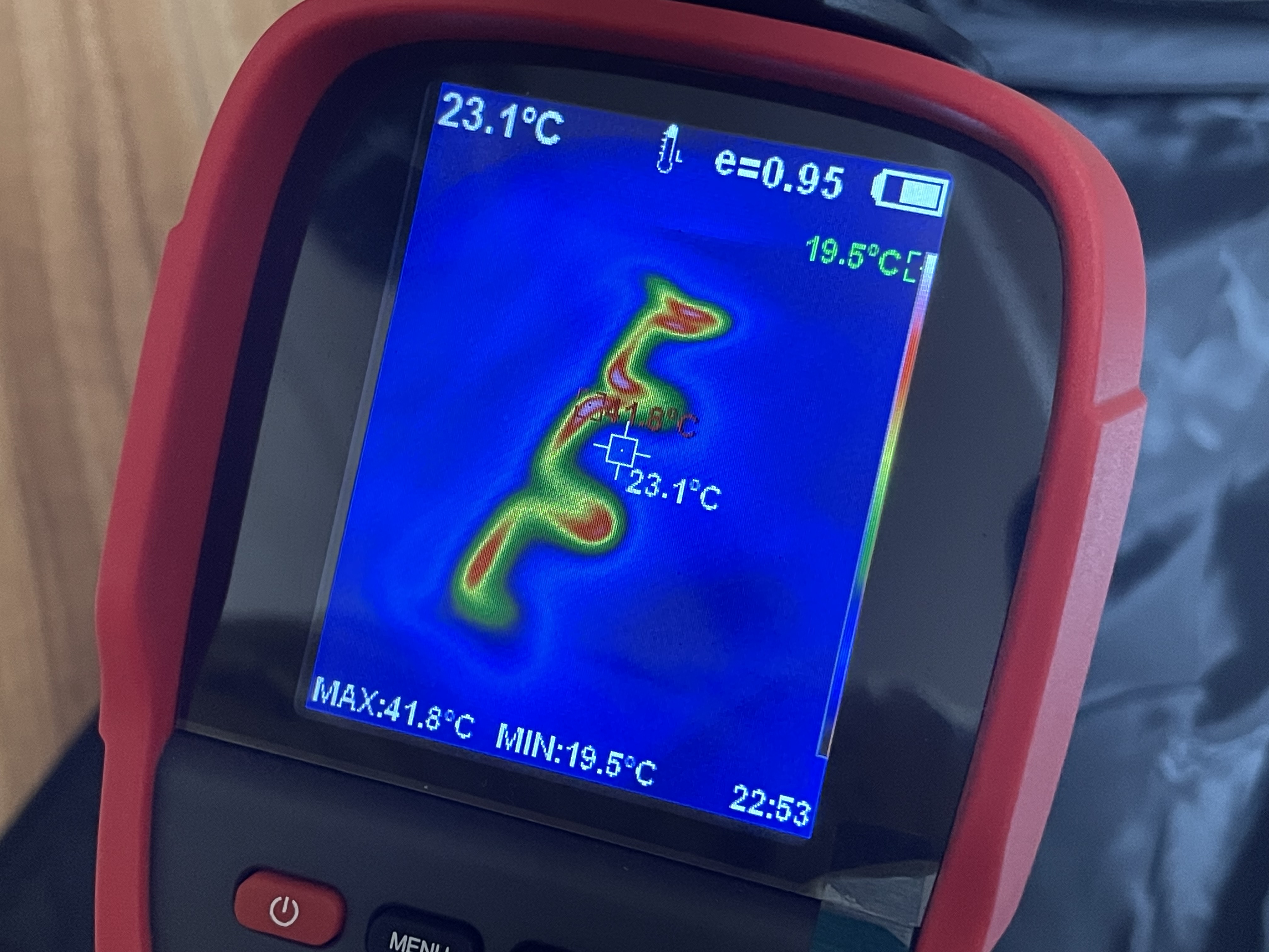 10W 출력이 가능한 보조배터리에 연결 후 열화상 카메라로 온도 측정을 해보았다. 목부분과 양쪽 어깨 부분에는 열선 패드가 들어있고, 나머지 부분은 그냥 열선만 깔려있는 모습이다.