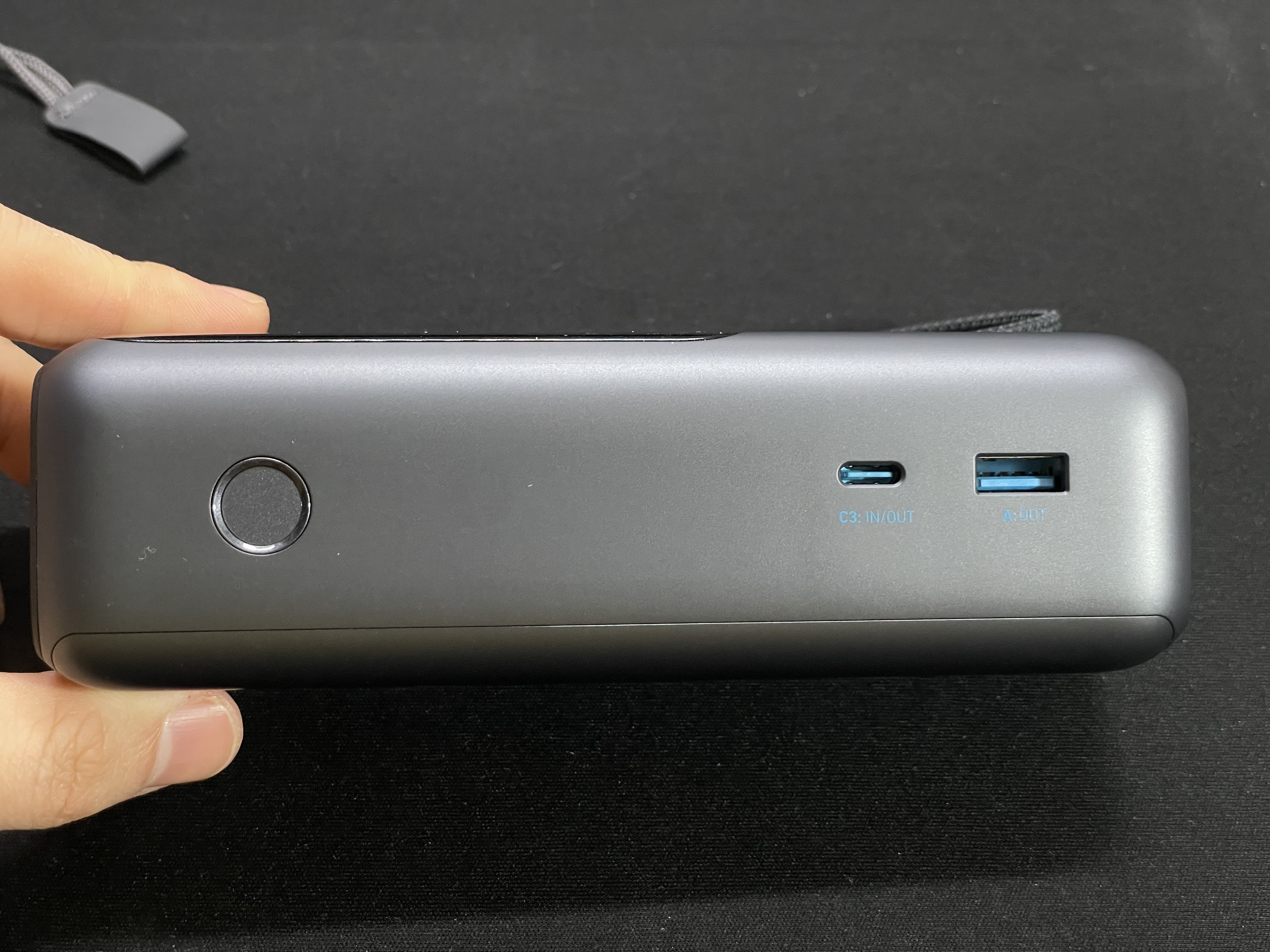측면엔 전원버튼과 usb c 포트 1개, A 포트 1개가 달려있다. 전원버튼은 디스플레이 화면전환과 저전력 기기(이어폰, 워치 등) 충전용 저출력 전환에 사용된다.