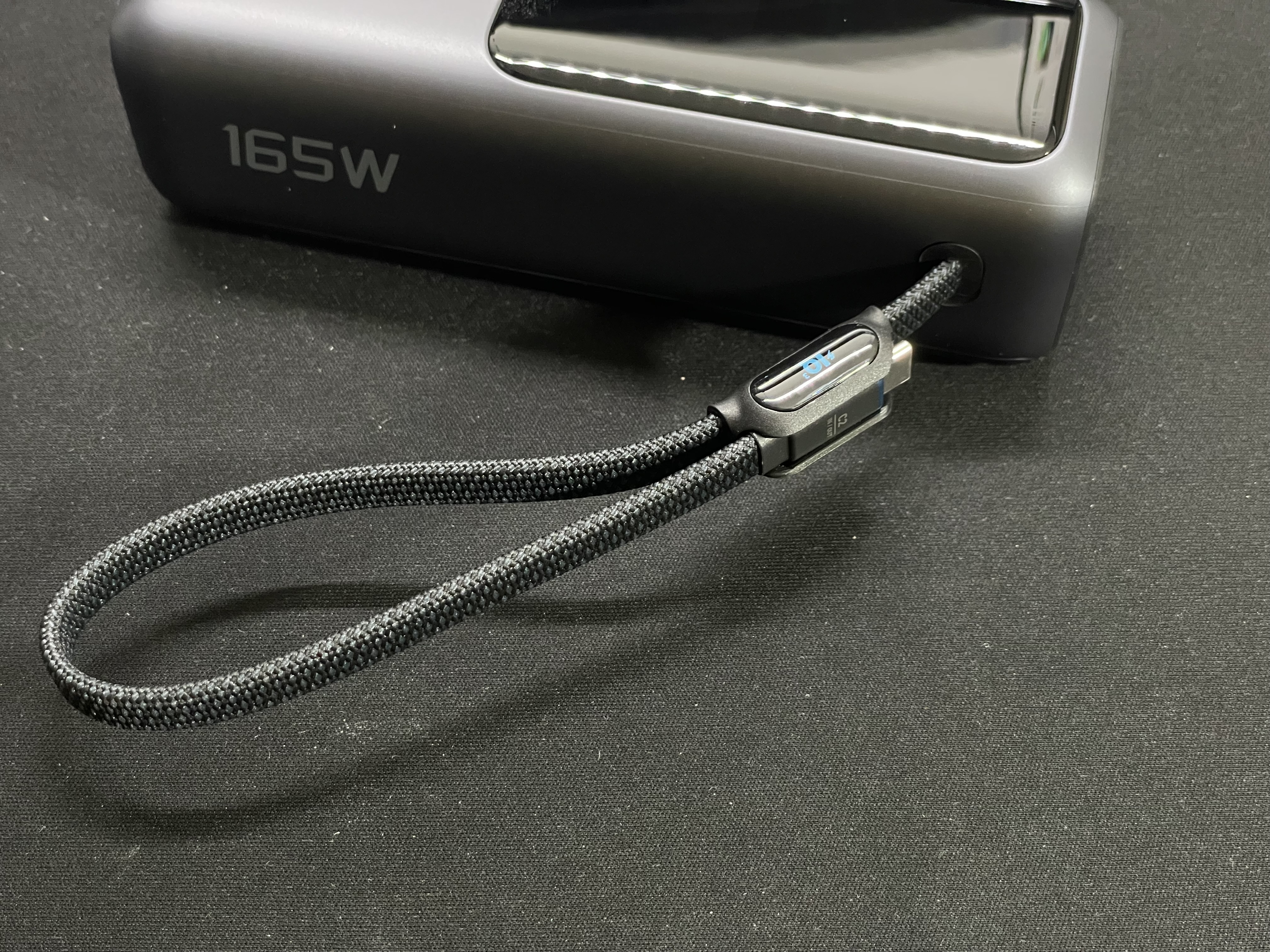 이 보조배터리의 특징 중 하나는 스트랩으로 사용이 가능한 USB C 케이블이 달려있다. 케이블은 20kg의 하중을 버틸 수 있게 설계되어 있어 일반적으로 사용한다면 단선 걱정은 하지 않아도 된다.