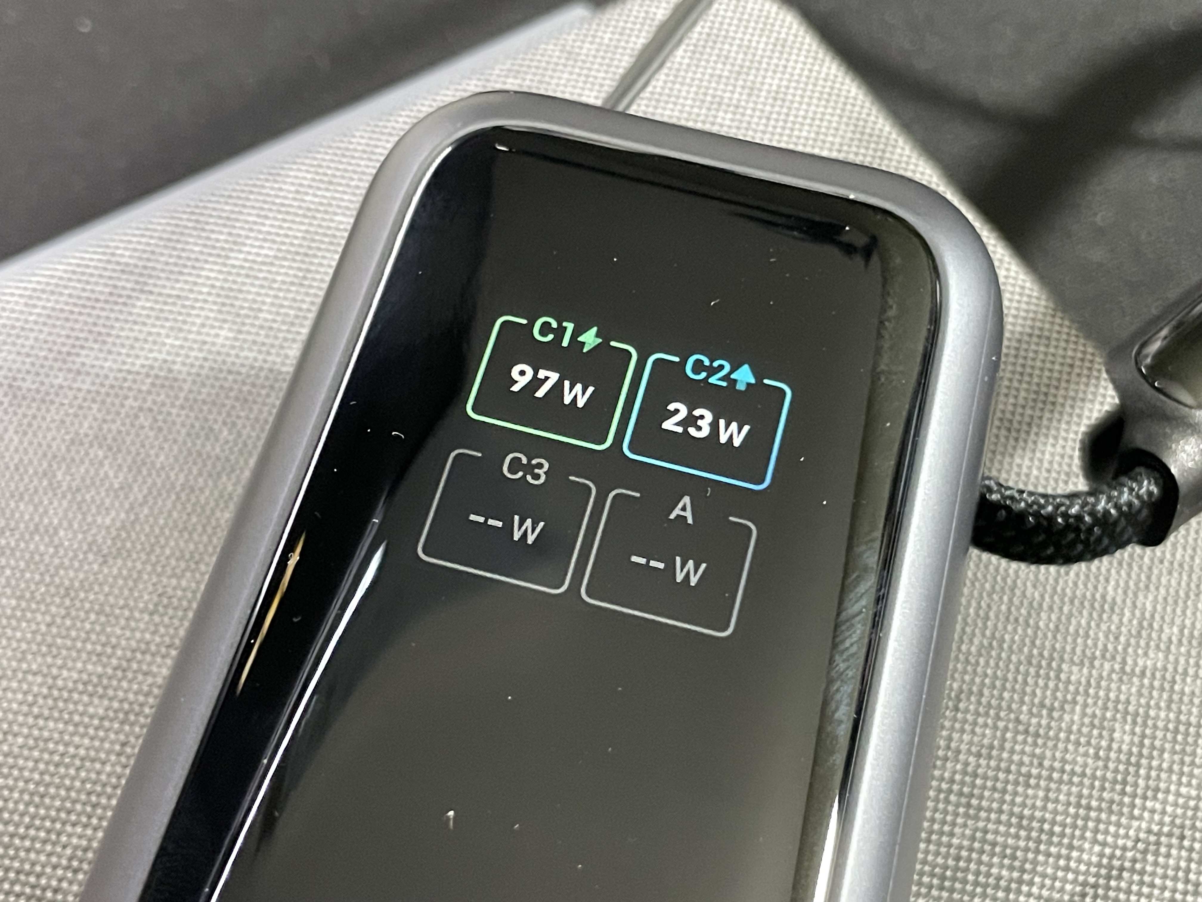 각 포트의 전력량 확인이 가능해서 편리하다. 보조배터리로 4개의 기기 충전 시 C포트 1개는 100W 속도가 보장되지만 나머지 포트 3개는 속도가 줄어서 총합 165W 출력이 가능하다.